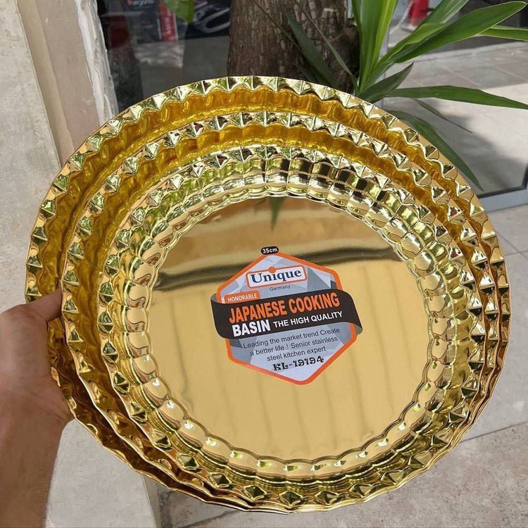 سرویس ۳ پارچه سینی کنگره ای استیل کیفیت عالی رنگ طلا واستیل برند یونیک رنگ ثابت ساخت چین ضخامت عالی وزن سنگین تک سلفون در سایز های سایز ۳۵ سایز ۴۰ سایز ۴۵ قیـ سه سایز : ۱.۵۰۰