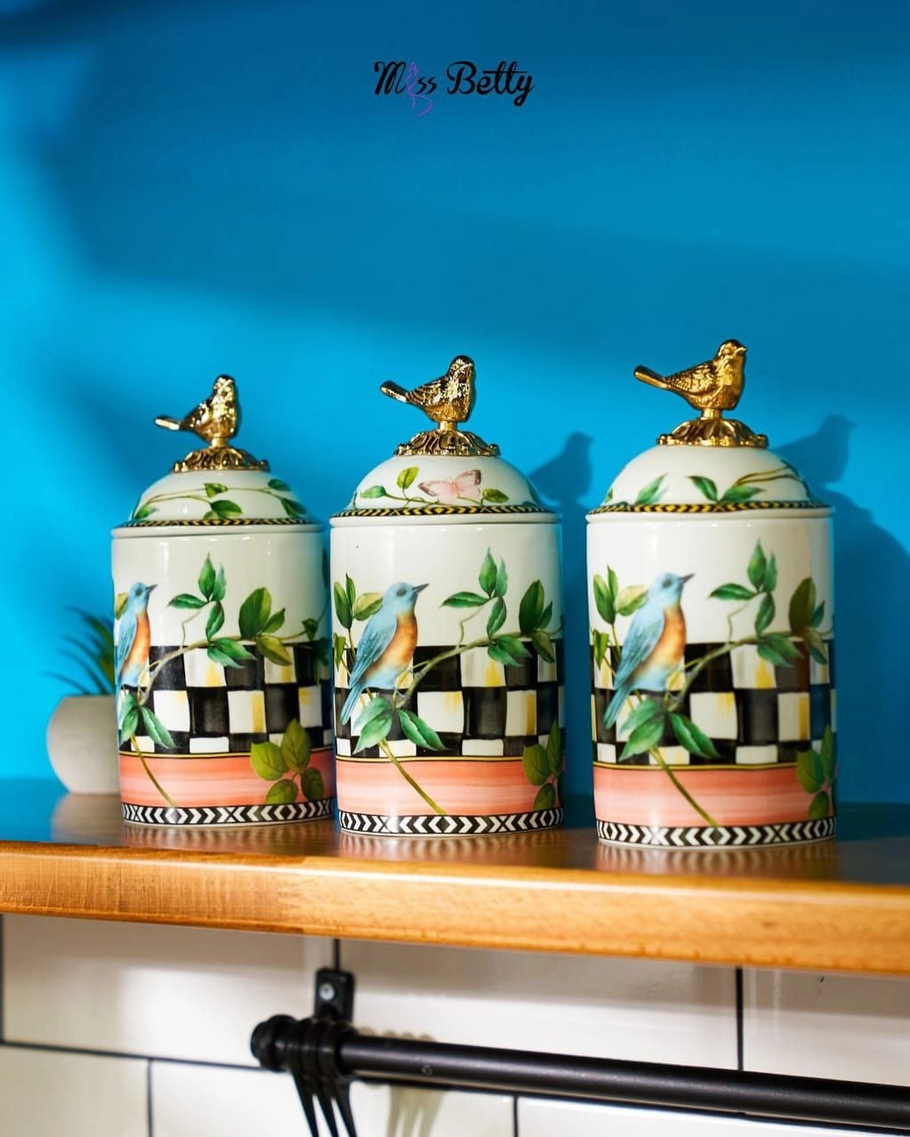 شارژ مجدد بانکه سه تایی در سه طرح پرطرفدار برند Miss Betty ترکیه جنس چینی سبک کیفیت عالی و رنگ ثابت درب دارای واشر ، وکیوم کامل ارتفاع 20 قطر 8 سانتی متر سه تایی