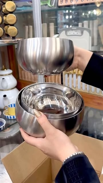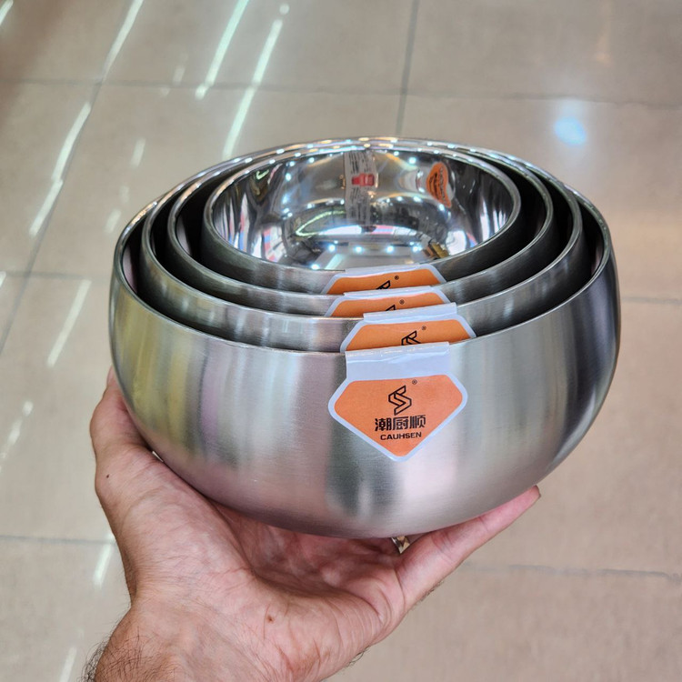 کاسههای استیل دوجداره پر طرفدارمون فوق العاده کاربردی و مناسب برای سرو انواع عذای سرد و گرم، میوه، آجیل، تنقلات، سالاد، ماست و … بسیار ساده و شیک شما در سریع ترین زمان ممکن به دستتون میرسه کاسه استیل نگیر دوجداره داخل کاسه ها براق و بدنه مات جنس استیل 304