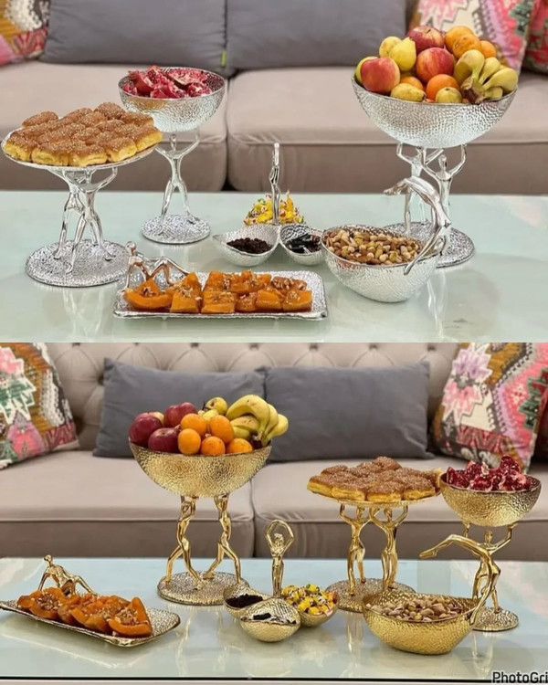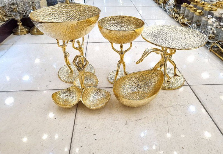 ست پذیرایی بالرین آلومینیوم ابکاری براق طلایی و نقره ای شامل میوه خوری، شیرینی خوری، اجیل خوری، شکلات خوری، اردو خوری، رولت خوری