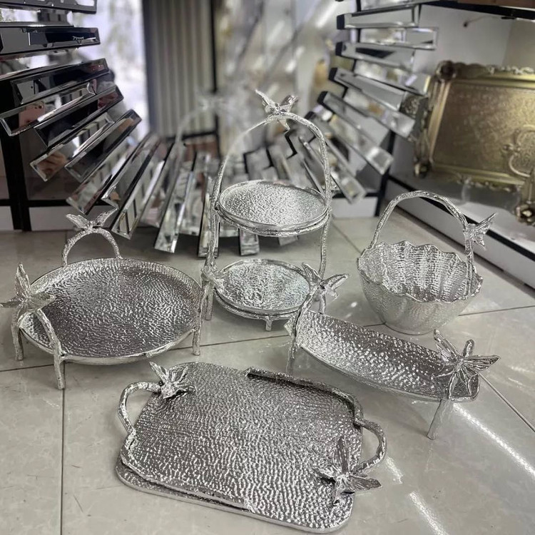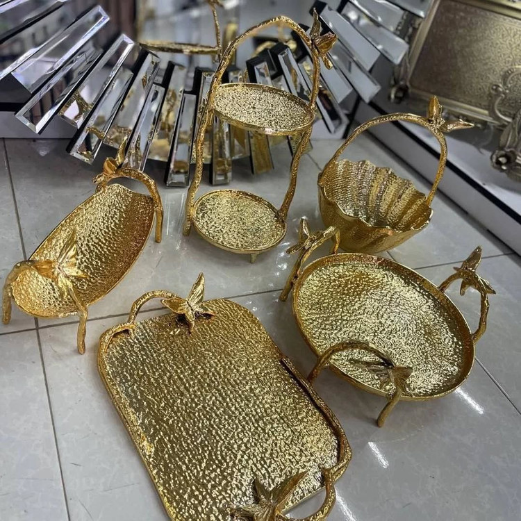 سرویس پذیرایی آلومینیوم ایوان پروانه۵تیکه در دورنگ طلایی و نقره ای براق شامل: میوه خوری آجیل خوری شیرنی خوری دو طبقه کشکول سینی مستطیل باکیفیت عالی با استثنایی