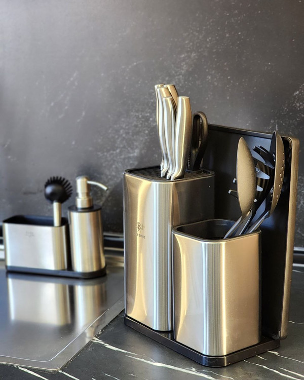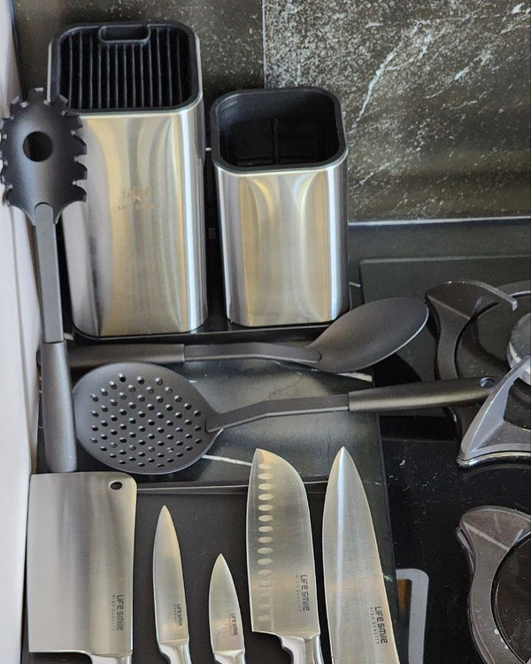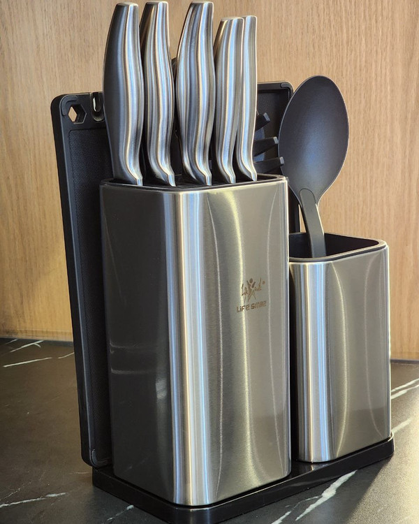سرویس کارد آشپزخانه از برند لایف اسمایل تماما استیل شامل تخته گوشت که روش چاقو تیز کن سوار شده و کفگیر ملاقه مورد نیاز آشپزی