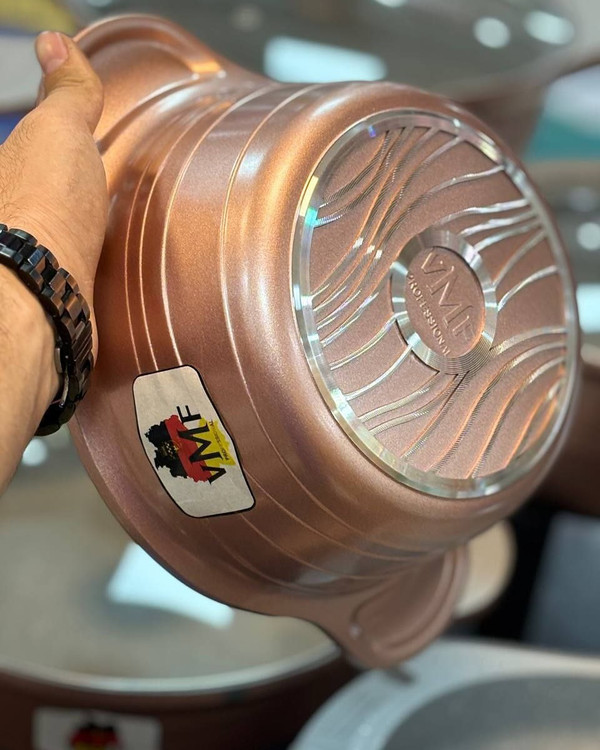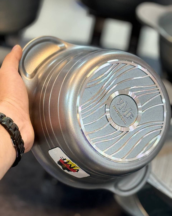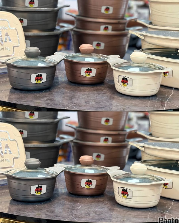 سرویس ۲۰پارچه وی ام اف(VMF) در گ جذاب کرم طوسیرزگلد این سرویس زیبا شامل قابلمه ۳۲۲۸۲۴۲۰۱۸ تابه دو دسته سایز۲۸ تابه رژیمی سایز ۳۲ یک عدد تابه مرغ و ماهی پز ۳ تیکه همراه با پیش بند و یک جفت دستگیره دارای ۲۴ ماه گارانتی قیـ.مت ۱۷م