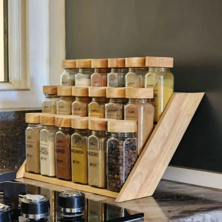 از واجبات هر آشپزخونس اول از کیفیتش بگم که باکیفیت ترین محصولات چوبیه پوسته پوسته هم نمیشه چون از جنس چوبه رابرووده. برند گلدن استار ست بانکه های ادویه چوبی ۱۸ عددی به همراه استند و ۴ مدل لیبل نام ادویه ها و در نمکپاشی بانکه ها روی استند به چهار صورت قرار میگیرن که هم روی اپن و هم داخل کشو قابل استفادس(داخل کشو به دو صورت و روی اپن به دو صورت) به همراه قیف برای پر کردن شیشه و چسب دوطرفه وارداتی ارتفاع هر بانکه ۱۲ سانت طول استند ۳۳ عرض استند ۳۰