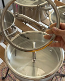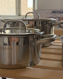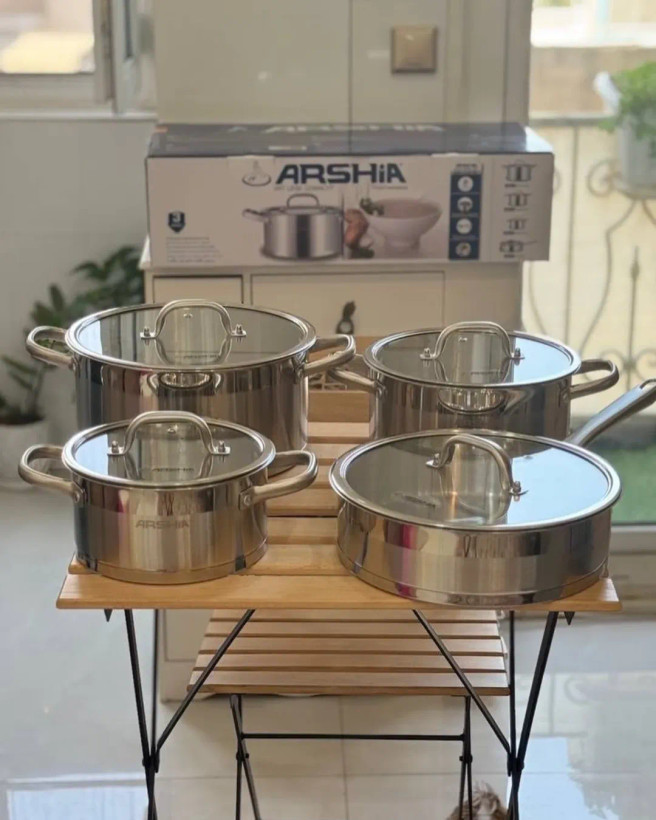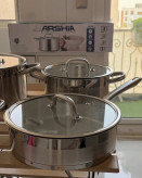 با سلام سالمترین ظروف پخت و پز سرویس قابلمه تمام استیل برند معتبر عرشیا ۸ پارچه شامل ۳ قابلمه سایز ۲۰۲۴۲۸ تابه تک دسته با درب سایز ۲۸ بسیار عمیق دارای ه ضمانت شرکتی قابلیت پخت برنج و سرخ کردنی کف ۵لایه چدن قابلیت استفاده بروی تمامی گازها دستگیره جدید و بروز این مدل شرکتی و بروز میباشد دستگیره ها داغ نمیشود جنس استیل ۱۸/۱۰ ارسال فوری از تهران برای مصرف کننده