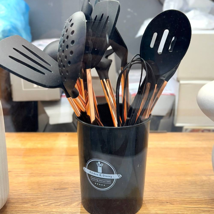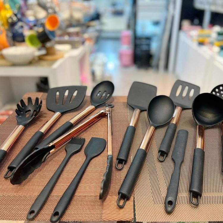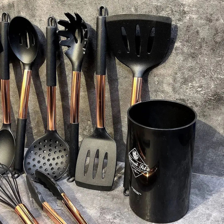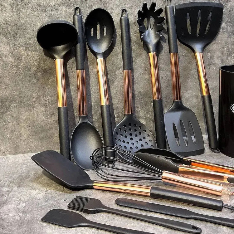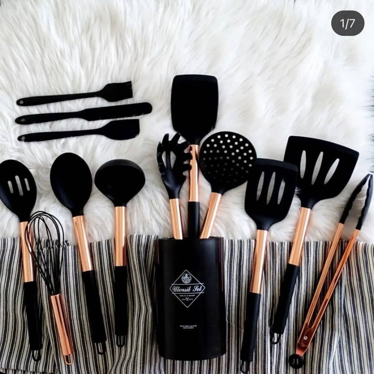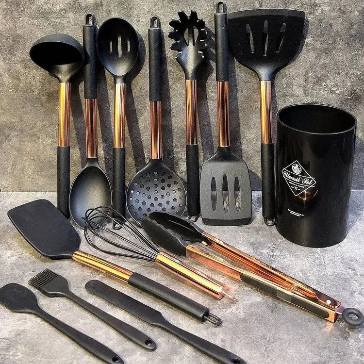ست کامل کفگیر و ملاقه جذاب و خاص 14 پارچه جنس دسته ها آلیاژ استیل با کاور رز گلد جنس ابزار سیلیکون کاملا نسوز با تحمل دمای 230درجه سانتی گراد داری تایید FDAامریکا جهت تضمین عدم جذب مواد سمی از قسمت سیلیکونی ابزار و عدم انتشار خواص سمی در حرارت بالای پخت و پز